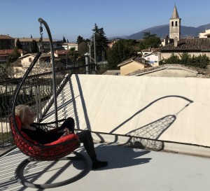 He sits “in a rocking chair with a special light”